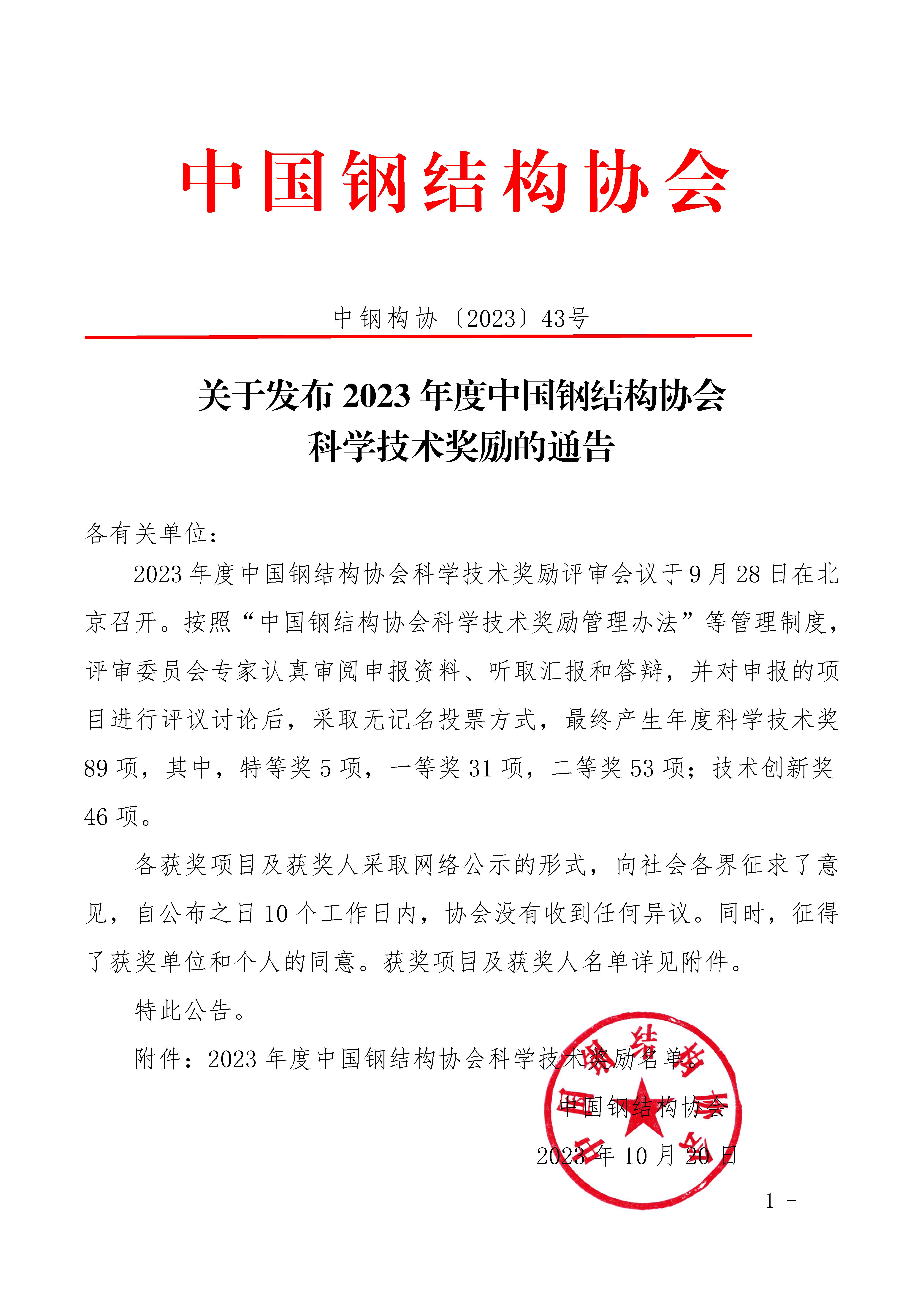 關(guān)于發(fā)布2023年度中國鋼結(jié)構(gòu)協(xié)會科學(xué)技術(shù)獎勵的通告