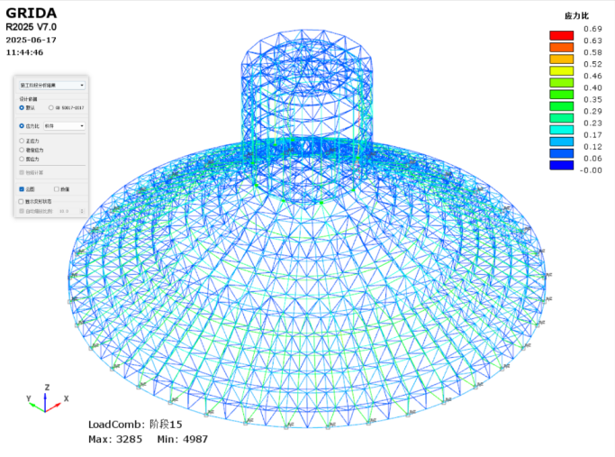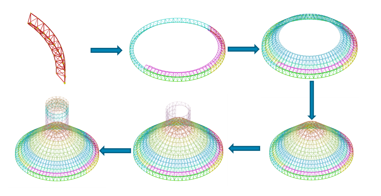 圖5 有限質(zhì)點(diǎn)法(FPM)網(wǎng)殼狀態(tài)疊加施工全過程分析