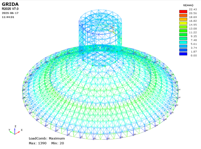 隨著工藝生產(chǎn)線產(chǎn)能的日益提高,散料貯倉的直徑日益增大,目前最大跨度(直徑)已經(jīng)達(dá)到了85m。散料貯倉上部網(wǎng)殼結(jié)構(gòu)是由桿件與球節(jié)點(diǎn)組成,隨著跨度的增加,其在設(shè)計(jì)、制造、施工、現(xiàn)場管理等方面面臨著高標(biāo)準(zhǔn)與獨(dú)特挑戰(zhàn)。水泥熟料貯倉是工業(yè)生產(chǎn)中典型的散料貯存設(shè)施,溫差大、跨度大、荷載多變等共同構(gòu)成了其關(guān)鍵技術(shù)的難點(diǎn)和設(shè)計(jì)重點(diǎn)。