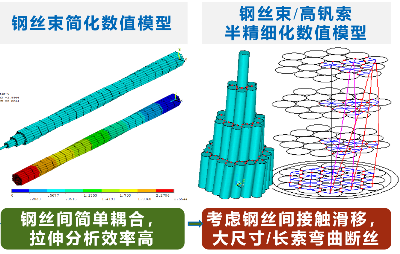 1)結合不同拉索內部鋼絲構造,建立考慮鋼絲絞捻和協同機制的半精細化有限元模型,提出了拉索半精細化數值分析方法,得到了拉索基本力學性能參數指標。