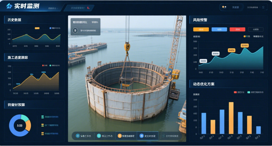 搭建“數字肌理-智能神經-決策中樞”三級系統,集成BIM+GIS與分布式光纖傳感網絡,實現3分鐘風險閉環響應與48小時滲漏預警。建立多參數耦合評價模型,精準防控砂層液化;研發封底混凝土溫控-應力智控技術,顯著降低裂縫率;依托數字孿生引擎與強化學習模型(圖3、圖4),實現沉放路徑優化與支撐荷載動態調整,推動深水圍堰進入“秒級感知、分鐘預警、小時決策”的智能運維新階段。