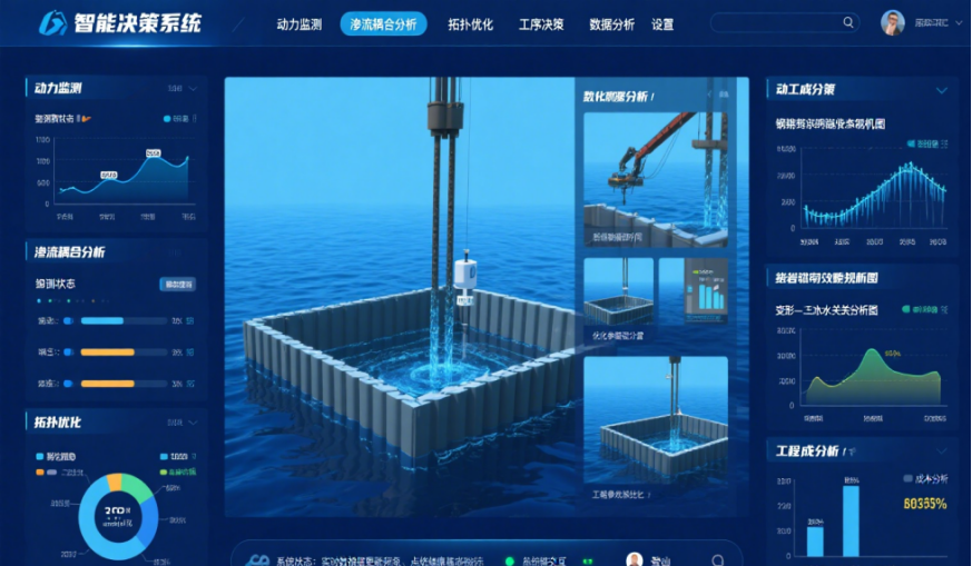 針對深厚粉細砂、潮汐帶、裸巖等復雜地質,構建多物理場耦合設計體系。提出沉樁動力響應模型與滲流-變形協同仿真方法,攻克流沙滲漏與鎖口疲勞難題;研發波浪力自適應抗浮系統與異形刃腳拓撲優化技術,顯著提升結構耐久性與適應性;集成數字孿生平臺,實現全流程碳足跡追蹤與精細化設計,推動圍堰設計從“經驗依賴”向“模型驅動”轉變。