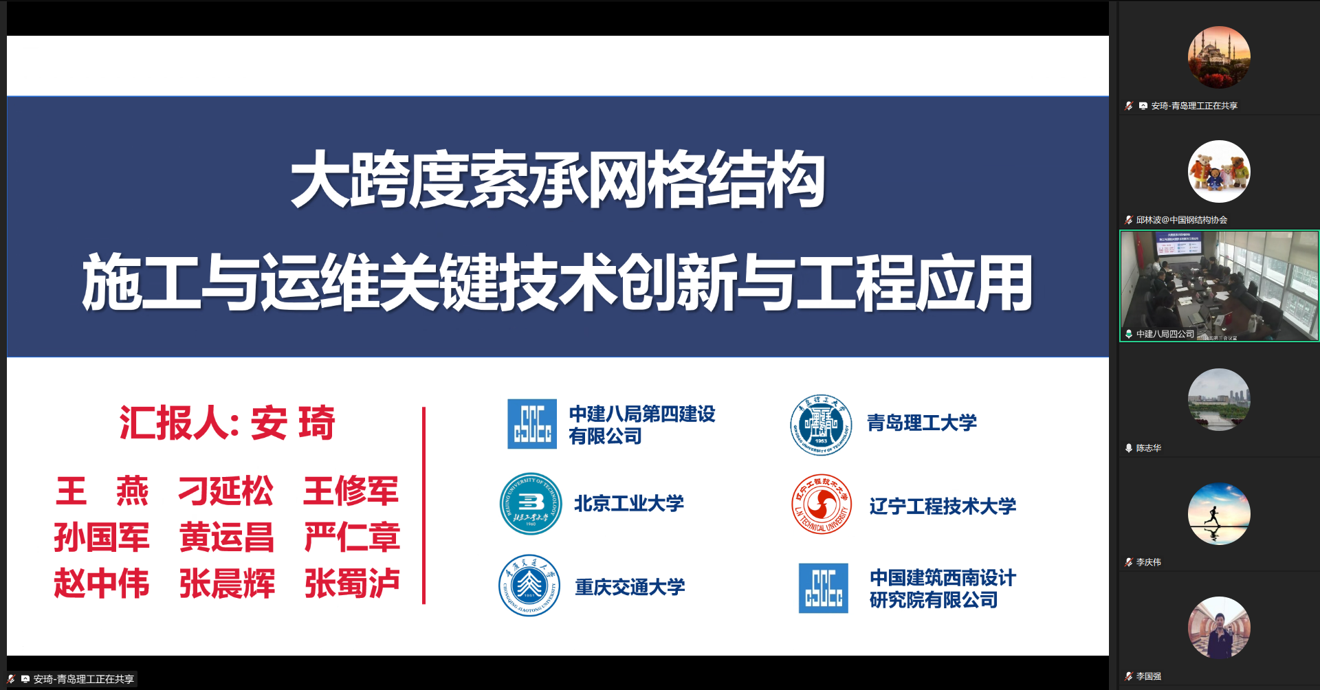 會上,青島理工大學安琦副教授代表項目組,匯報了項目研究背景、關鍵創新技術及成果應用等內容。評價專家們審閱了技術資料,經質詢和討論,認為項目組針對大跨度索承結構施工與運維關鍵技術與工程應用等問題,開展了系統的研究,取得的主要創新成果如下: